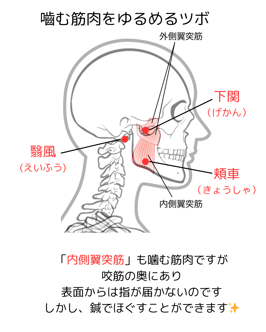 これらのツボを刺激すると、咬筋・内側翼突筋の緊張が解け、顎の可動域が改善します。